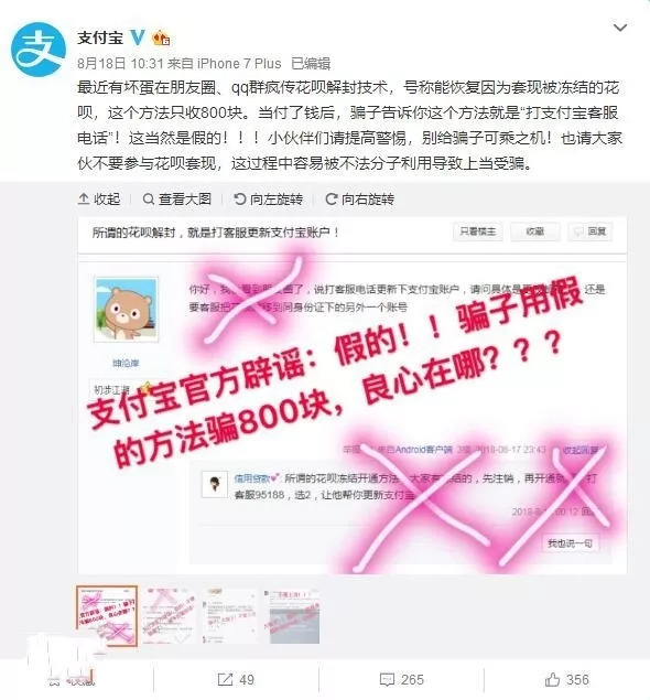 这两天,花呗可以通过外部解封的谣言一直不绝于耳,支付宝官方也不断出来辟谣,没有所谓的花呗解封技术,都是骗子!