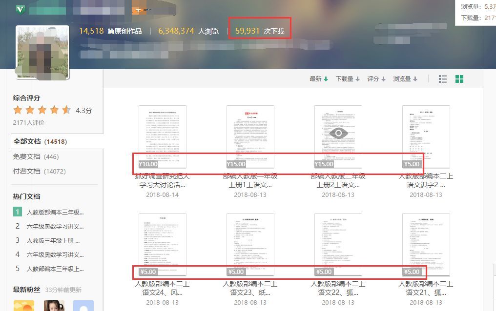 付费文档有10元,15元,5元,大多数都是5元,已经有接近6万次的下载,即使是除去一半的免费文档,也有3万次的下载量,一篇5元,也有15万元左右的收益。并且是重复多次收益。用户躺着睡觉也有收益!