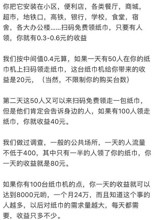 终端用户每天可以免费领取一包纸巾,代理商每送出一包纸巾收益最低是三毛。