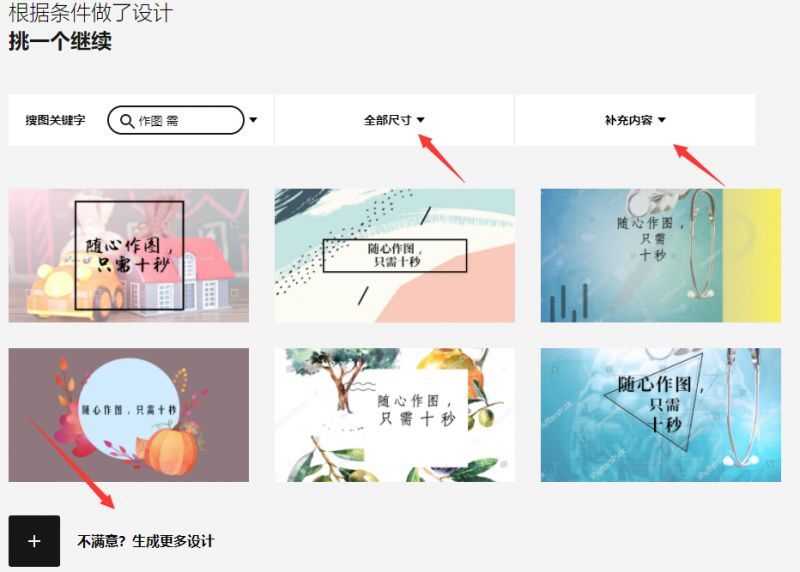同时我们还可以选择尺寸,添加补充内容等等,如果你对以上作图不满意的话还可点击生成更多设计