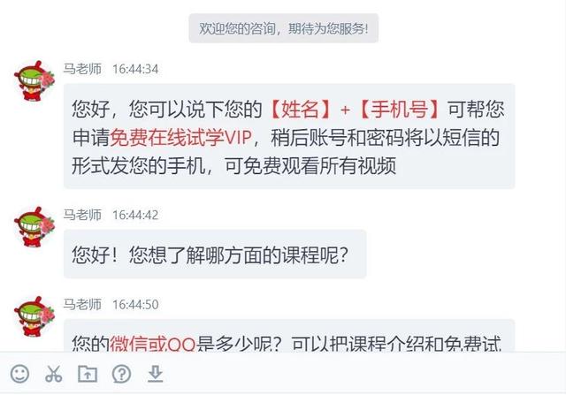 我通过UI产品页面进去,所以,在询问时完全可以将“您想了解哪方面的课程呢?”替换为“您报名UI培训是打算转行UI还是想提升自身能力呢?”
