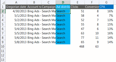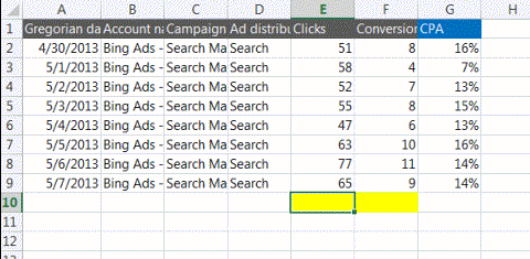 当你想快速插入一列时,键入Ctrl + Shift + ‘=' (Shift + ‘='其实就是+号啦)就能在你所选中那列的左边插入一列,而Ctrl + ‘-‘(减号)就能删除你所选中的一列。
