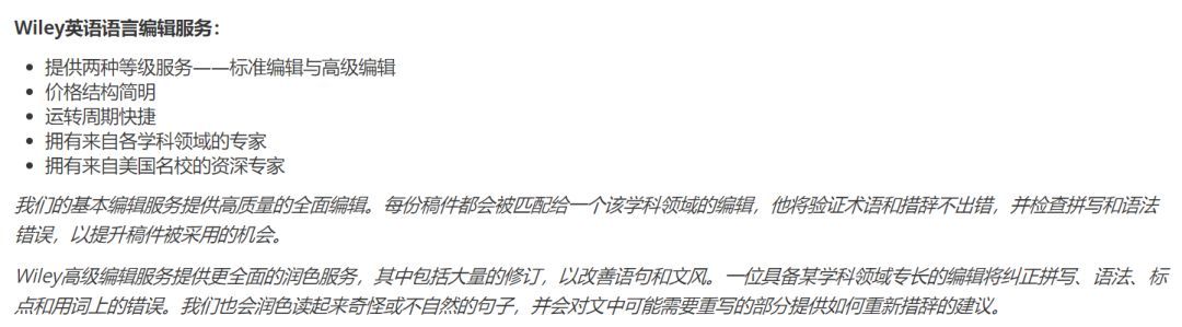 Wiley并没有和其他机构一样提供“无限次润色直到发表”的高级服务,Wiley的高级润色是指对文章文风和措辞上的修改,所以不算入我认为的高级服务。