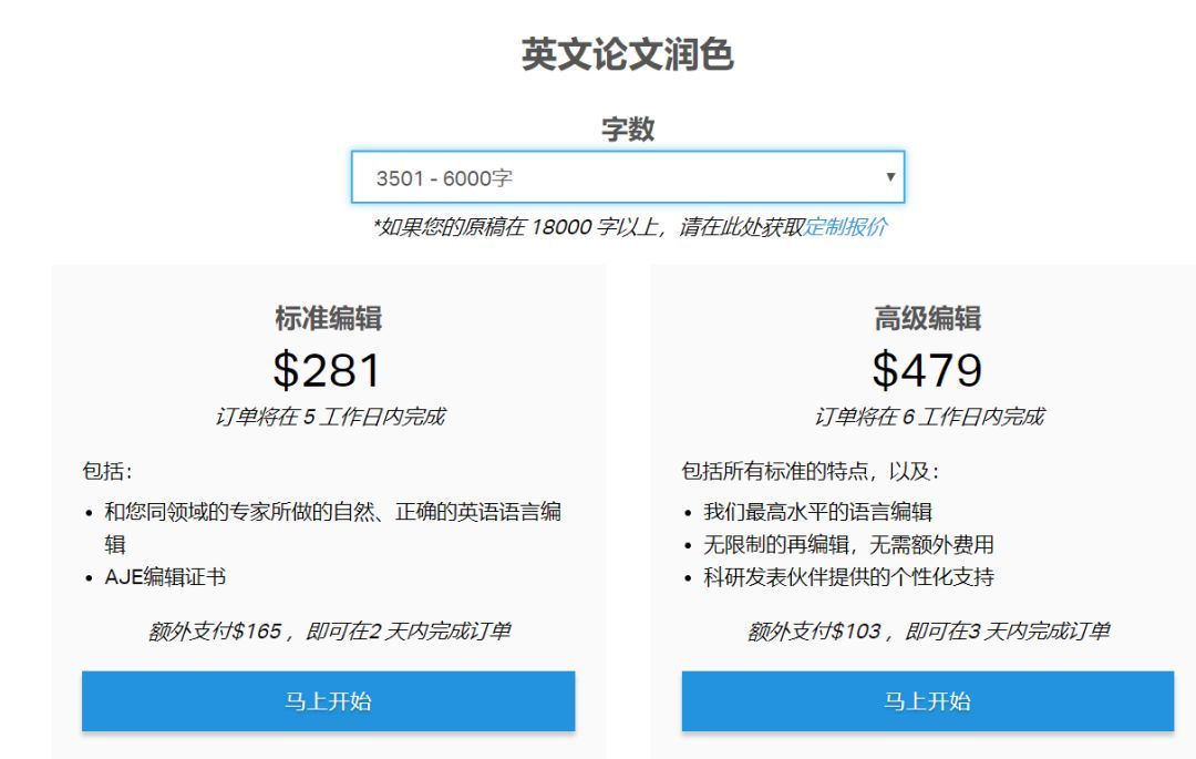 AJE很老牌的一个美国润色机构,好像是最早做英文论文润色的机构之一。AJE的基本服务是价格6000单词5天281刀,高级服务价格是6天479刀(AJE给予首单减免20刀,推荐给他人使用40美元的优惠券)。