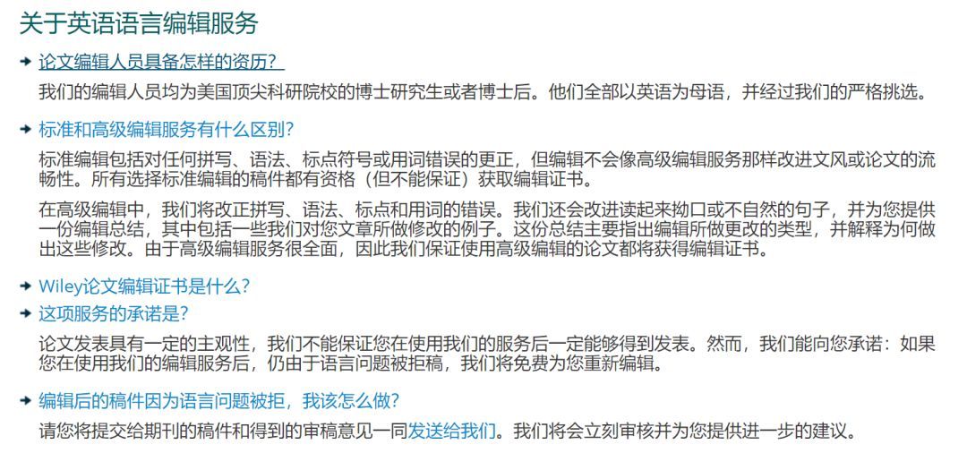 Wiley为自己的基本润色提供保证:只(英文版本中有个Alone,中文没有) 因语言问题被杂志拒稿,免费重新编辑润色。
