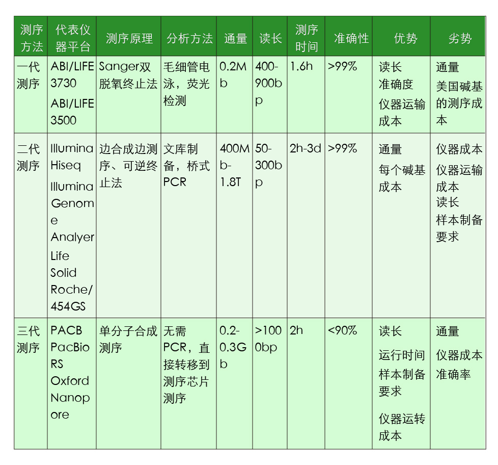 基因测序从1977年的第一代Sanger测序技术发展至今,已经有40年的发展历程。1987年,Applied Biosciences公司基于Sanger测序原理发布第一台自动测序仪,第一代测序读长长,准确率高,后来成为人类基因组计划的主力机型,而现在也依然是测序的金标准。尽管第一代测序在准确度的优势明显,但是存在成本高、通量低等缺点,制约其大规模商业应用。经过技术发展和流程优化,以罗氏454、illumina、Life的Solid系统为主的第二代测序技术出现,促使测序成本以超摩尔定律下降,并且大幅提高测序速度,以前完成一个人类基因组的测序需要3年时间,而使用二代测序技术则仅仅需要1周。但是缺点就是读长太短,后续需要通过生物信息学软件进行数据组装。2008-2010年密集出现的第三代测序技术可谓惊艳全球。第三代测序技术是单分子测序,由于不需要对样本进行扩增等前期准备工作,测序时间大幅缩小,理论准确性将提高,成本进一步下降,相比于第二代测序技术优势明显,但是目前由于准确性低、测序信号易丢失等因素,尚且处于科研阶段。第四代测序技术更加先进,但也存在第三代技术的问题,短期内无法商用。