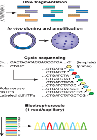 第一代基因测序法即Sanger法,采用的是直接测序法,是1975年由桑格(Sanger)和考尔森(Coulson)提出的经典的链终止法。其基本原理即双脱氧核苷三磷酸(ddNTP)缺乏PCR延伸所需的3'-OH,因此每当DNA链加入分子ddNTP,延伸便终止。每一次DNA测序是由4个独立的反应组成,将模板、引物和4种含有不同的放射性同位素标记的核苷酸的ddNTP分别与DNA聚合酶混合形成长短不一的片段,大量起始点相同、终止点不同的DNA片段存在于反应体系中,具有单个碱基差别的DNA序列可以被聚丙烯酰胺变性凝胶电泳分离出来,得到放射性同位素自显影条带,依据电泳条带读取DNA双链的碱基序列。第一代基因测序技术代表为ABI公司3700系列荧光标记自动核酸分析仪,Sanger测序法是测序技术的金标准,其测序长度可达1000bp,准确性几乎100%,但存在通量低、成本高、耗时长的不足,严重影响其大规模应用。人类基因组计划主要是基于第一代基因测序技术平台。