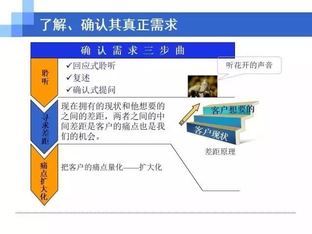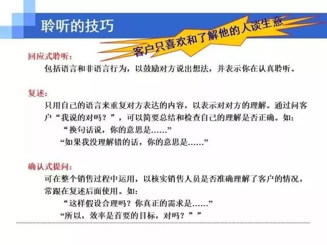 3、有效地引导客户说出销售代表要说出的话是一种对话技术。