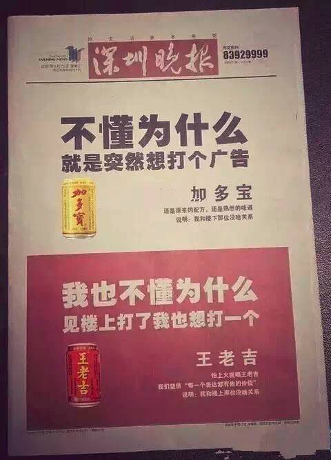 国企出身的广药深谙中国式干系,擅长于行使功令和制度有效袭击对方每一个微弱点,前后告状加多宝21次,索赔46亿,并以21:0的傲人战绩轻松击败加多宝,统统都是辣么自然和简单,毫无呆滞,就像农人伯伯去地里收冬天的萝卜同样。但在营销战争中修炼了多年的老司机加多宝却屡出奇招,步步为营,硬生生的在连输21场官司的环境下,把王老吉逼得喘不过气来。