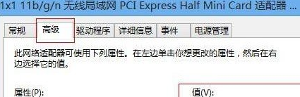 3.在打开的属性窗口中,咱们将界面切换到高级这一栏,在属性下的方框中找到并选中802.11n这一项,然后旁边的值的窗口中设置为混合模式。
