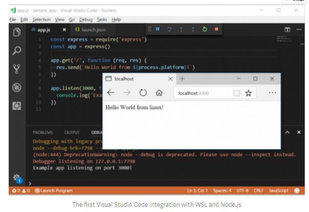 我还与微软的其他团队合作,希望WSL能与其他产品很好的结合。例如Visual Studio Code,它是Java和Node.js中最流行的文本编辑器。使用Visual Studio代码的开发人员可以从WSL中获益良多。主要的优势在于使运行在WSL中的Node.js代码调试变得更容易。开发人员可以在运行WSL的Windows计算机上编写Linux版本的Node.js并进行调试。