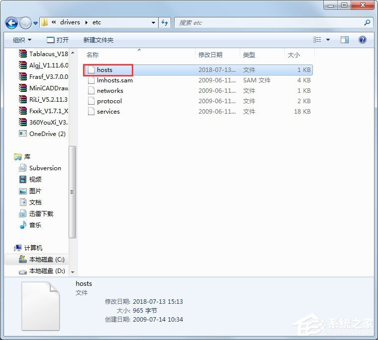 6、进入etc文件夹以后,就可以看到里面有个文件命为“hosts”的文件,双击选择记事本打开;