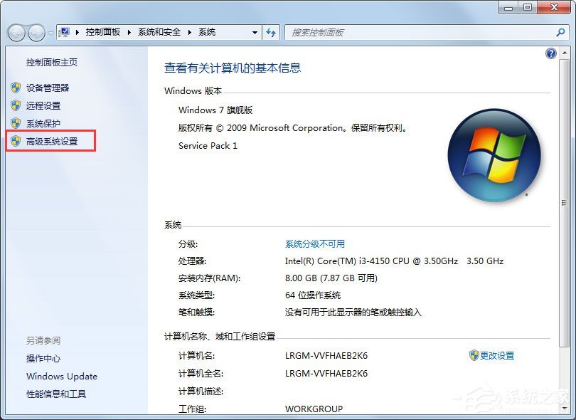 7、右键桌面“计算机”图标,在菜单中选择属性,打开系统属性窗口,左侧菜单中选择“高级系统设置”;