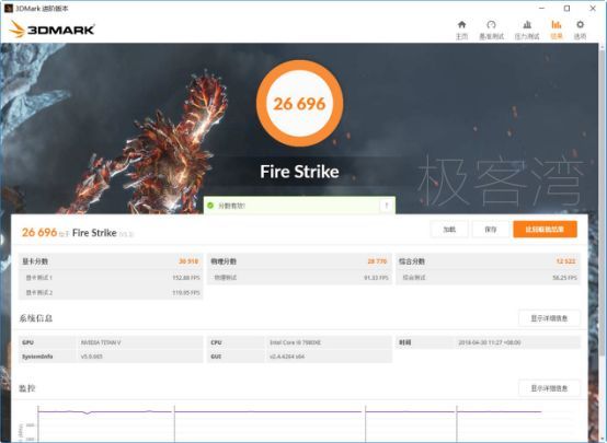 在新3DMark的Fire Strike中也高了一丁点儿,达到了26696分,相比TTXP提升了5%的样子吧...