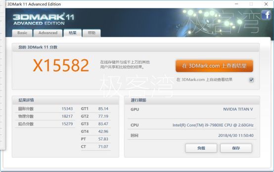 在3DMark11 Extreme中,默频下图形分倒是直接破了15000分大关: