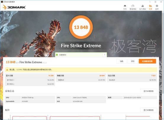 FSE相比FS,测试分辨率从1080P提升到了2560x1440的2K,更能体现复杂3D环境下的综合水平,这时的总分达到了13848分,可以说是非常强大了。