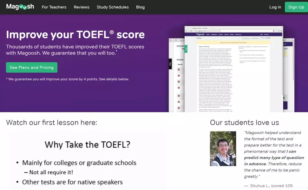 Magoosh 网站上提供了330多道精心编撰的托福模拟练习题,而更厉害的是,网站为每一道题目都配备了非常详细的讲解视频,剖析题目和答案的内在逻辑。除此之外,网站还有150多个有关学习方法和考试策略的视频可供选择。