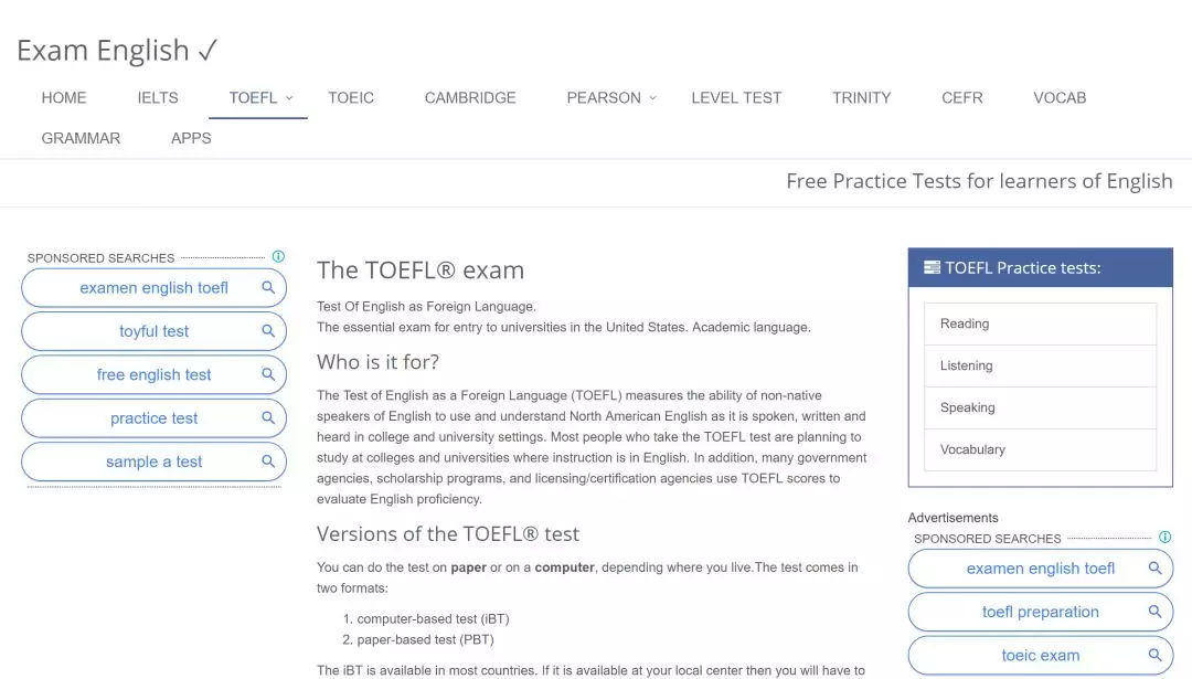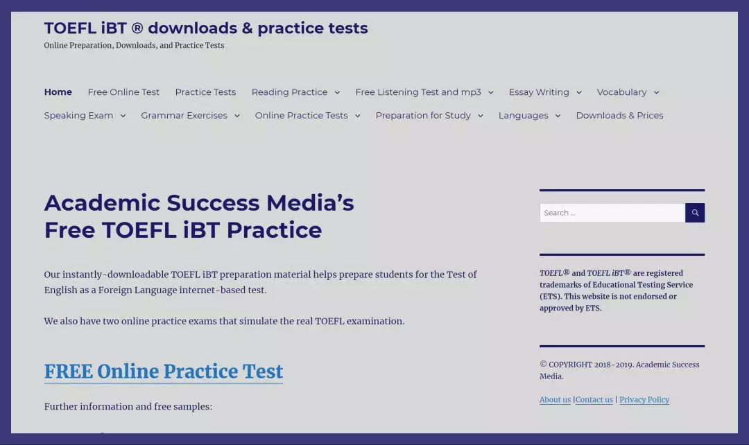 Exam English 是另一个非常热门的托福学习网站。这个同样是完全免费的网站几乎囊括了所有和托福相关的复习资料,包括不同题型的练习,托福模考,学习建议等等。你甚至可以通过这个网站预约托福考试(但是保险起见建议大家还是直接通过托福官网报名登记)。