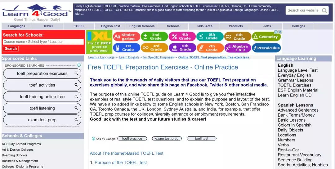 Learn4Good 是准备托福考试的热门网站之一。本网站建立的初衷就是为了给大家解决托福考试相关问题。通过 Learn4Good,你可以看到托福考试结构、得分、问题和经验分享等等。