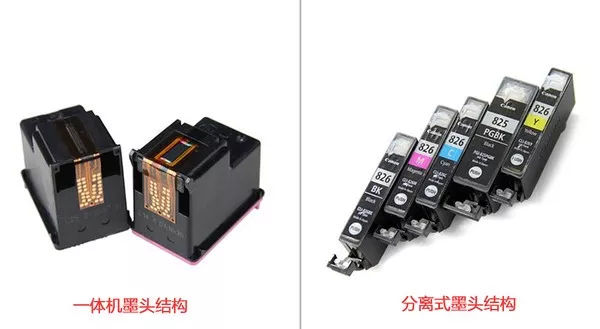 目前,比较常见的喷头结构主要分成:喷墨头和墨水盒一体机与分离式两种。其中,一体机墨头结构在墨水盒墨水用尽后,墨头和墨水盒要一起更换,其优点是结合比较紧密,可靠性较高,但相对的成本也会较高;而分离式结构,顾名思义墨头和墨水盒是分离的,因此在墨水用尽后可单独更换墨水盒,相较而言更节省成本。