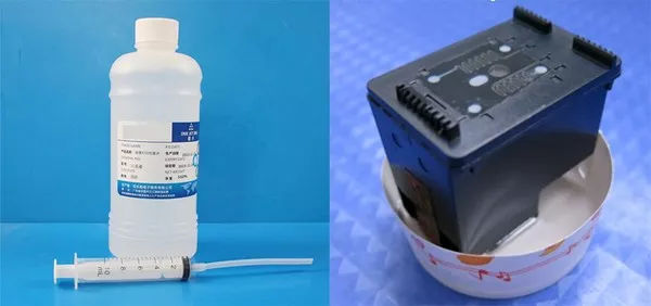 再来说说如何处理硬性堵头。当堵塞情况较轻时,可以先在光滑的平底金属容器里,加入少许95%浓度的有机溶剂酒精,以刚好没过打印头不锈钢包边为准(切勿让PCB板接触到酒精),浸泡2小时到4天不等;若遇喷头堵塞较为严重,除了浓度95%的酒精外,还需要准备一个洁净的杯子,一支一次性注射器和一次性输液器。利用注射器虹吸作用产生的压力,将酒精注入打印头中以达到清洗干涸墨头的作用。