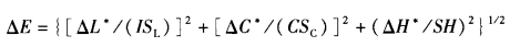 该计算公式中的ΔL*、ΔC*、ΔH*表示由CIELab色差公式计算得到的标准样与待测样之间的亮度差、饱和度差和色相差;式中I和C是为调节明亮度和饱和度相对宽容量的两个系数,对色差可接受性样品评价时,取I=2,C=1,公式也相应的表示为CMC(2:1),而塑胶、油漆、油墨的L则为1.4。
