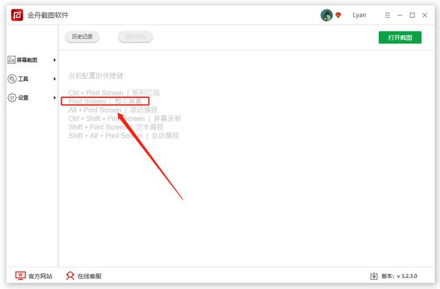 在软件主界面中,可以看到软件当前配置的快捷键,print screen键(F12右边的那一个)就是全屏的快捷键。