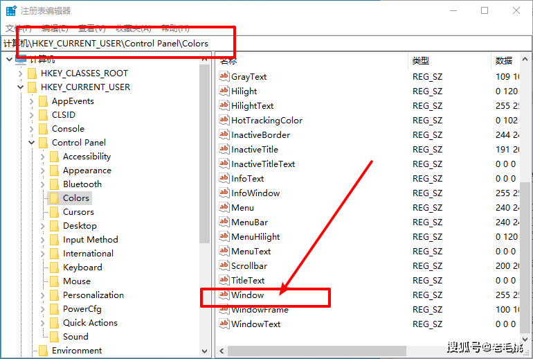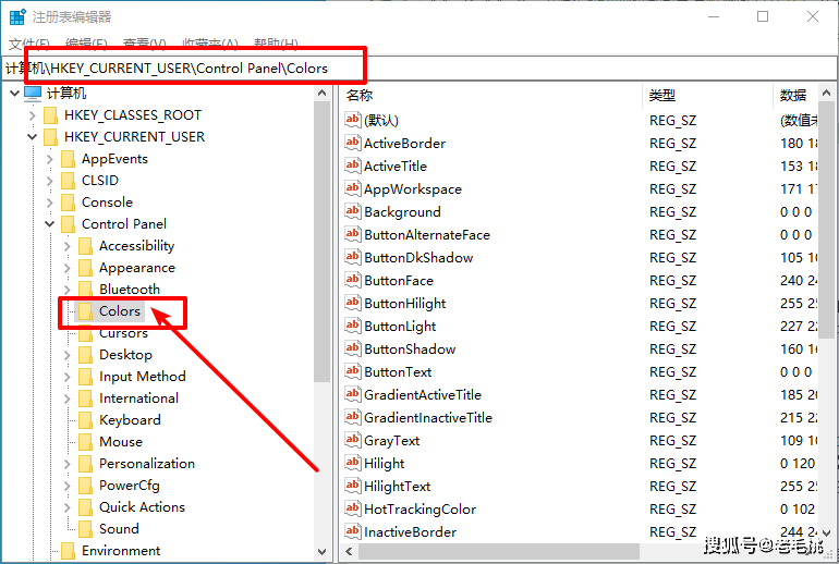 3、之后,依次按照路径展开【HKEY_CURRENT_USER->Control Panel->Colors】
