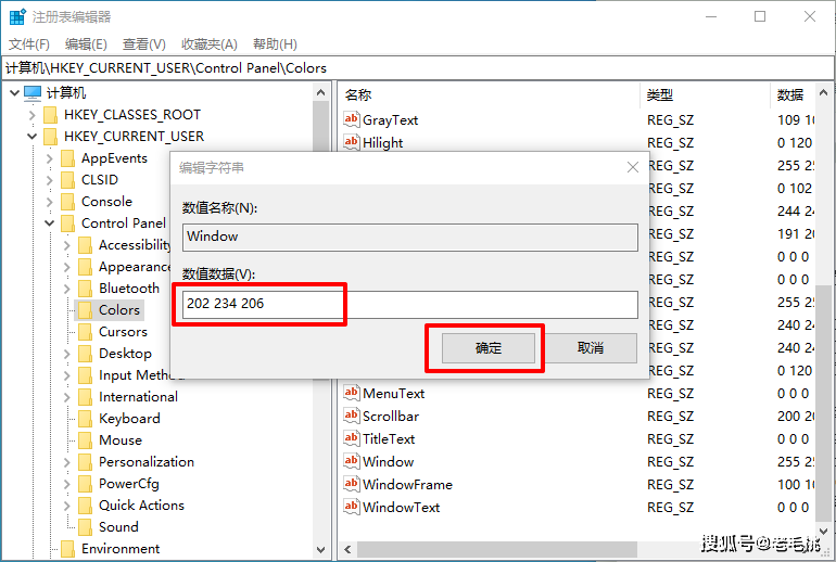 5、然后,如果你想要绿色作为保护色,那么将数值数据则修改为【202 234 206】即可,如需恢复原来的颜色,则重新设置为【255 255 255】即可