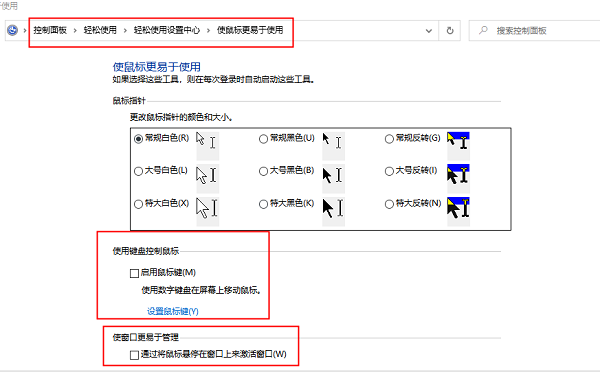 打开电脑中的控制面板→轻松使用→轻松使用设置中心→设置鼠标键。可以更改鼠标的样式、添加键盘控制鼠标、使鼠标更好管理等功能,可以根据个人的电脑使用习惯来设置。