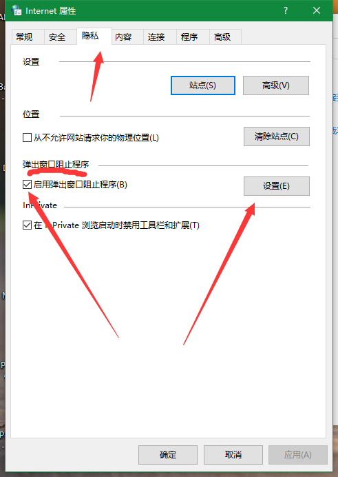 完成上一步之后就会弹出这个对话框,在最上面的菜单栏一处我们选择“隐私”,然后将“启用弹出窗口阻止程序”前面的勾勾上,勾上后再点击右边的“设置”。