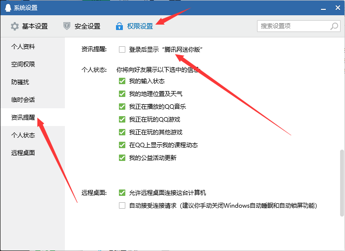 还没完,先别关闭这个窗口,接着我们找到最上方的“权限设置”下的“资讯提醒”,将右方的“登录后显示腾讯迷你版”前面的勾去掉就好了,做完这些你的QQ就不会弹出广告了,除非你是不小心点了有木马病毒的链接什么的!