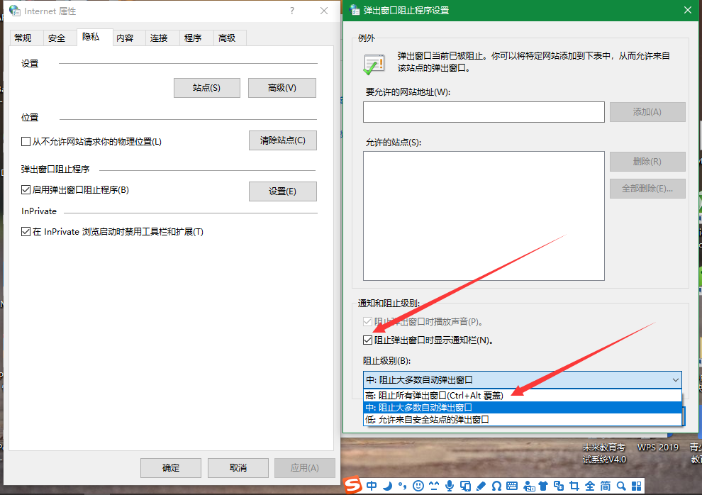 点击刚才的“设置”之后就会弹出如下面图片右半部分所展示的窗口,也就是弹出“弹出窗口阻止程序设置”这个窗口,在这个窗口里面,我们找到“通知阻止级别”,然后将“阻止弹出窗口时显示通知栏”前面的勾勾上,接着根据自己的需求选择“阻止级别”,对于我来说中级就已经够用了,现在我的电脑上每次开机以及平时使用的时候都没有出现任何的广告!就是进行了这些设置,相信大家之前都没有进行过这样的设置吧。还有,如果选中级没有用就换成高级!
