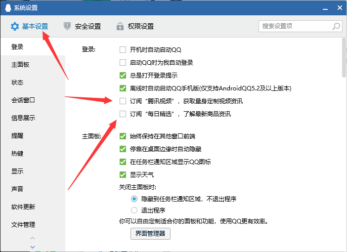 前面工作就不讲了,直接讲重点吧!找到QQ里面的设置,然后就会弹出相应的窗口,如下面第一张图所示的页面,在基本设置、登录这一项的右侧我们可以看到有两个罪魁祸首,我分别用红色的箭头指出来了,把登录下面有“订阅”两个字的选项的前面的勾去掉就可以了。