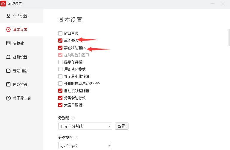二、打开系统设置后,在左侧找到“基本设置”,然后找到“桌面嵌入”,在这两项前面的方框中点击勾选开启。如果想将便签固定在一个位置的话,可以勾选“禁止窗体移动”,注:禁止窗体移动的开启和关闭只能先勾选“桌面嵌入”后才能执行。
