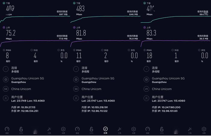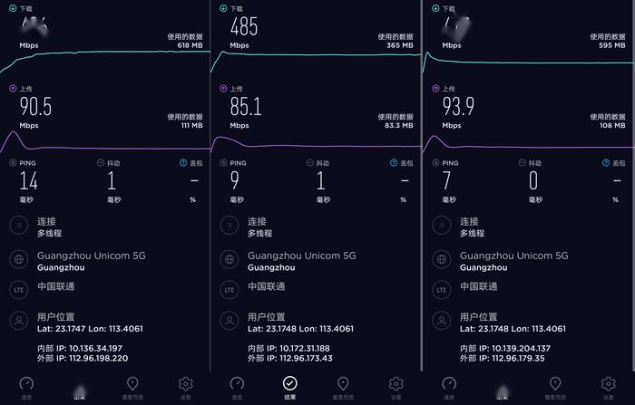 测试条件:空旷地带,室温33℃,体感温度39℃。采用限速500Mbps联通手机卡,轮流插卡测试。
