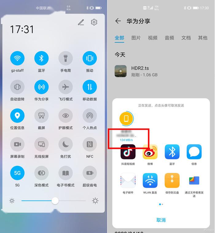 经过实际测试,荣耀30 Pro发送给另外一台荣耀30 Pro 1GB大小的视频,耗时约为10s,其中我们看到最高的网速可以达到124MB/s,因为使用了荣耀30 Pro上内置的WiFi 6+技术进行传输,比市面上主流的20-30MB/s互传效率有了极其显著的提升。