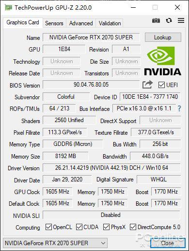 再来看看显卡方面,七彩虹ProMaster H1的显卡采用了NVIDIA GeForce RTX 2070 SUPER,支持多方面的AI加速和实时光线追踪等新特性。