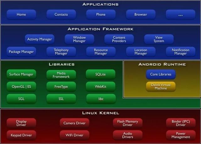 传统意义上的安卓系统架构,可见显示驱动、相机驱动等等都是被打包在Linux内核当中的