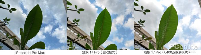 说实话,一开始我们认为魅族 17 Pro会有提升,但是没想到的是最终的提升竟然会这么明显。图片还没放大,就能看得出iPhone 11 Pro Max的HDR效果有些不尽人意,虽然能将天空的亮度压了下去,但是树叶也随之变得昏暗,这一点魅族 17 Pro不管在自动模式下,还是6400万像素模式下,HDR的效果都要好于iPhone,绿叶与天空的细节都保留的不错。(点开图片查看原图)