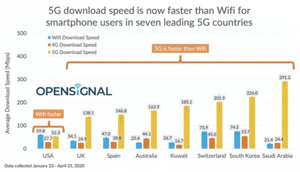 据悉,Opensignal的数据显示,在下一代移动技术已被成熟部署的八个国家中,有七个国家的5G网络的下行数据速率比Wi-Fi快得多。