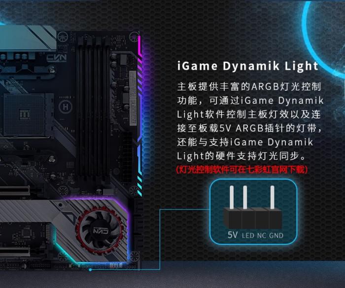 作为一款主打电竞的主板,CVN X570M搭载了5V ARGB接口,支持接入可编程LED灯扇以及可编程LED灯带等发光设备。利用七彩虹的iGame Dynamik Light软件,可以同时调整主板灯效和接入5V ARGB插针的设备。从而让实现更多的灯光效果,玩家得以进行更丰富的灯光配置。