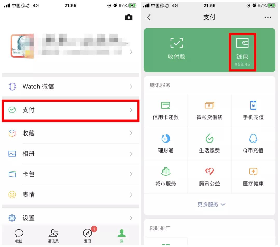 1、打开微信点击“我”→“支付”→“钱包”