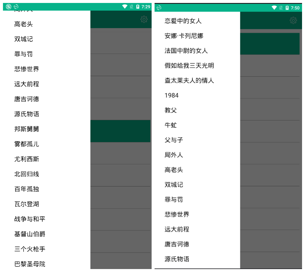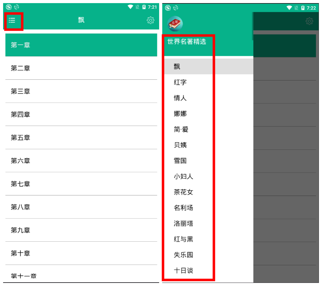 1、打开后点击左上角菜单栏,可以打开名著的目录,上下滑动,可以看到大约有100本,都是你耳熟能详的名著。