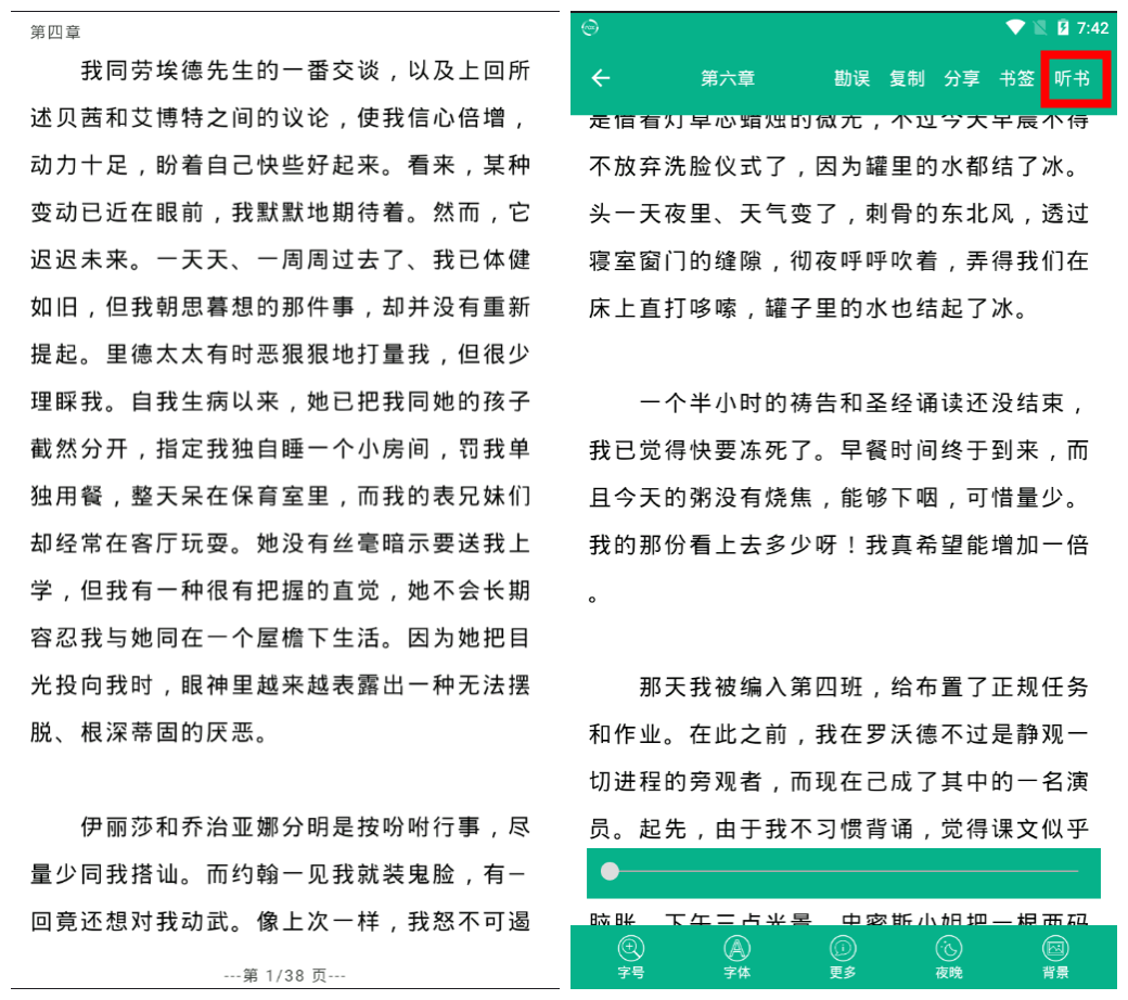 3、单击屏幕可以进行翻页,点击屏幕中间可以调出选项,比如可以点击“听书”放松眼睛。