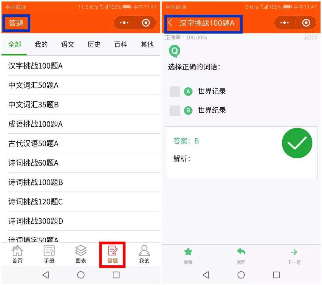 5、在下方还有“手册”、“图表”、“答题”等选项,都包含了丰富的知识,还可以测试自己的水平。