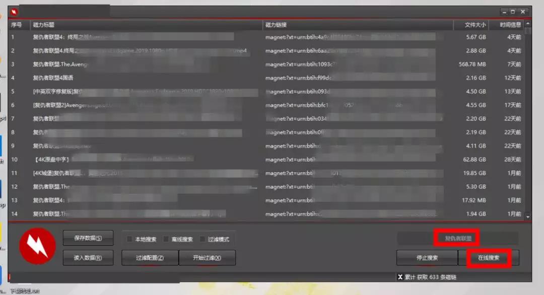 3、这工具与以往有点不同,它的搜索框居然在右下角,在这里输入关键后,点击“在线搜索”即可~(比如这部电影),想停止搜索的话,点击“停止搜索即可”。