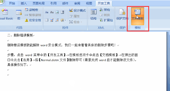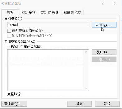 (1)在字菜单中单击[开发工具],在模板选项卡中单击[文档模板],然后在弹出窗口中单击[选择],