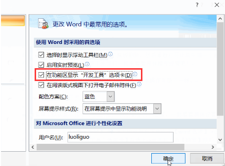 (2)在跳出的窗口中,勾选[在功能区域中显示“开发工具”选项卡],然后单击右下角的[确定]。