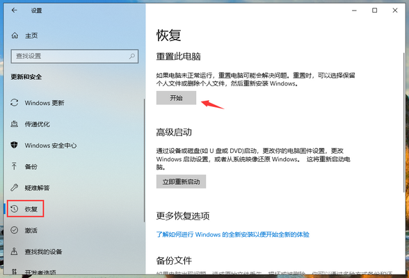 2、点击窗口左侧的“恢复”,再点击右侧“重置此电脑”下方的开始按钮。